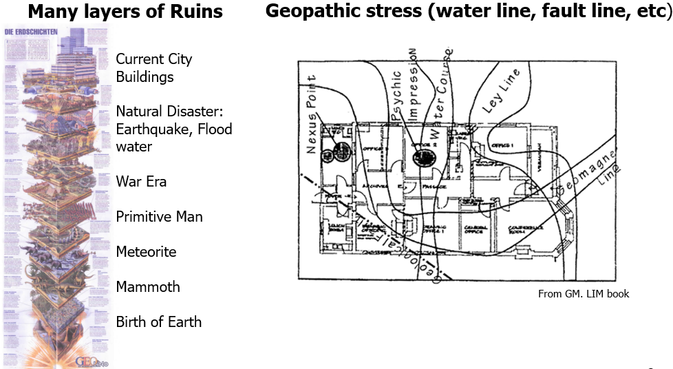 風水学には様々な手法がありますが、弊社が一番重要視しているのは、その土地物件のエネルギー状態です。地下には水脈や活断層を始め、癌などの原因になるネガテイブなエネルギーもあり、ドイツでは国が率先して放射線防止の対策を呼び掛けています。その他自然災害の影響や長い歴史の中で繰り返された戦いや宗教的な儀式など目に見えない影響も、地下深くには染み込んでおり、これらの霊的な影響もあります。